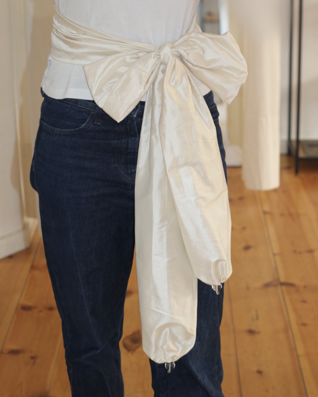 Product Details: Silk sash / belt adorned with glass beads and clear quartz stitched individually by hand.